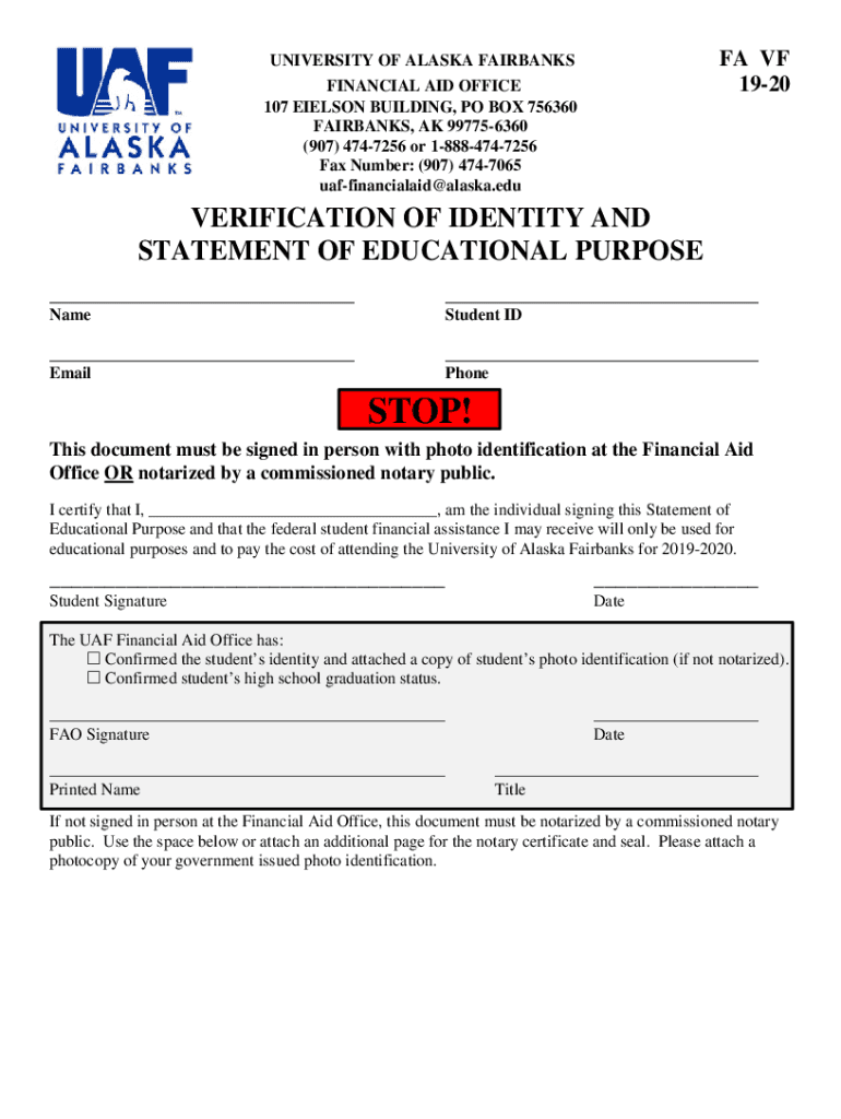 FA VF 1920UNIVERSITY OF ALASKA FAIRBANKS FINANCIAL AID OFFICE 107 NIELSON BUILDING, PO BOX 756360 FAIRBANKS, AK 997756360 (907) 4747256 or 18884747256 Fax Number: (907) 4747065 uaffinancialaid Alaska.