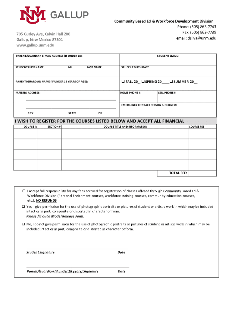 Community Based Ed & Workforce Development Division Phone: (505) 8637743 Fax: (505) 8637739 email: Silva UNM.edu705 Gurley Ave, Calvin Hall 200 Gallup, New Mexico 87301 www.gallup.unm.edu PARENT/GUARDIAN