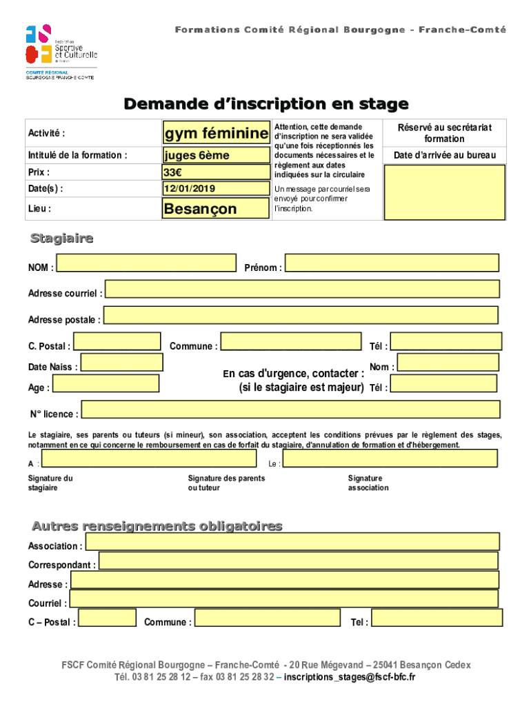 For m at ions Co m it Rio Na l BO your go one For a NC hero m t Demanded inscription en stage Activity :gym fminineIntitul de la formation :jugs 6mePrix :33Date(s) :12/01/2019Lieu :BesanonAttention,