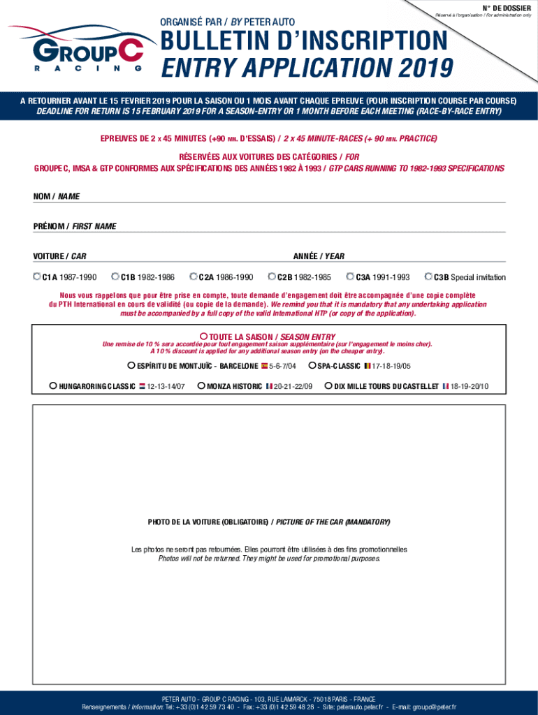 N DE DOSSIERRserv organization / For administration onlyORGANIS PAR / BY PETER AUTOBULLETIN INSCRIPTION ENTRY APPLICATION 2019 A RETURNER SAVANT LE 15 FEVER 2019 POUR LA SAIGON OF 1 MOI SAVANT CLAQUE