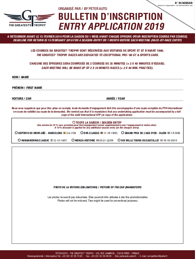N DE DOSSIERRserv organization / For administration onlyORGANIS PAR / BY PETER AUTOBULLETIN INSCRIPTION ENTRY APPLICATION 2019 A RETURNER SAVANT LE 15 FEVER 2019 POUR LA SAIGON OF 1 MOI SAVANT CLAQUE