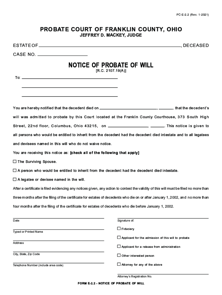 PCE2.2 (Rev. 12021)PROBATE COURT OF FRANKLIN COUNTY, OHIO JEFFREY D. MICKEY, JUDGEESTATE OF, DECEASED CASE NO.NOTICE OF PROBATE OF WILL R.C. 2107.19(A) To:You are hereby notified that the decedent