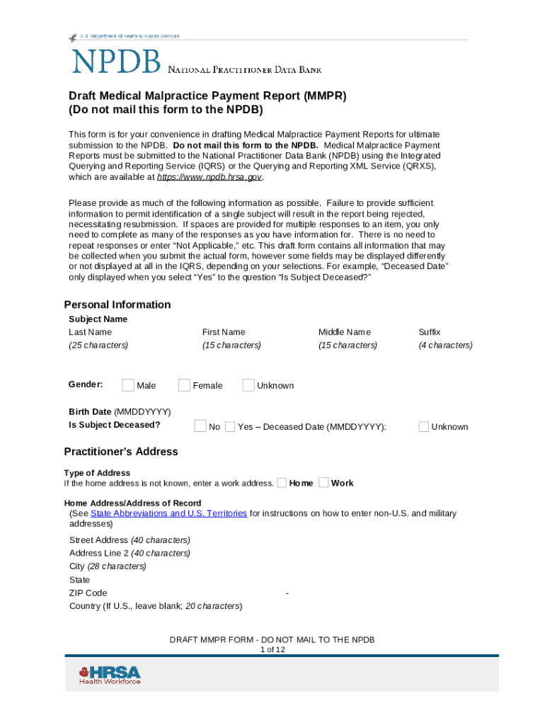 The Medical Malpractice Payment Report Draft (MMPR) is a crucial document for reporting medical malpractice payments to the National Practitioner Data Bank (NPDB). Its primary purpose is to ensure that healthcare professionals fulfill their reporting obligations accurately. Compliance with NPDB submission requirements is essential for maintaining transparency in healthcare practices.