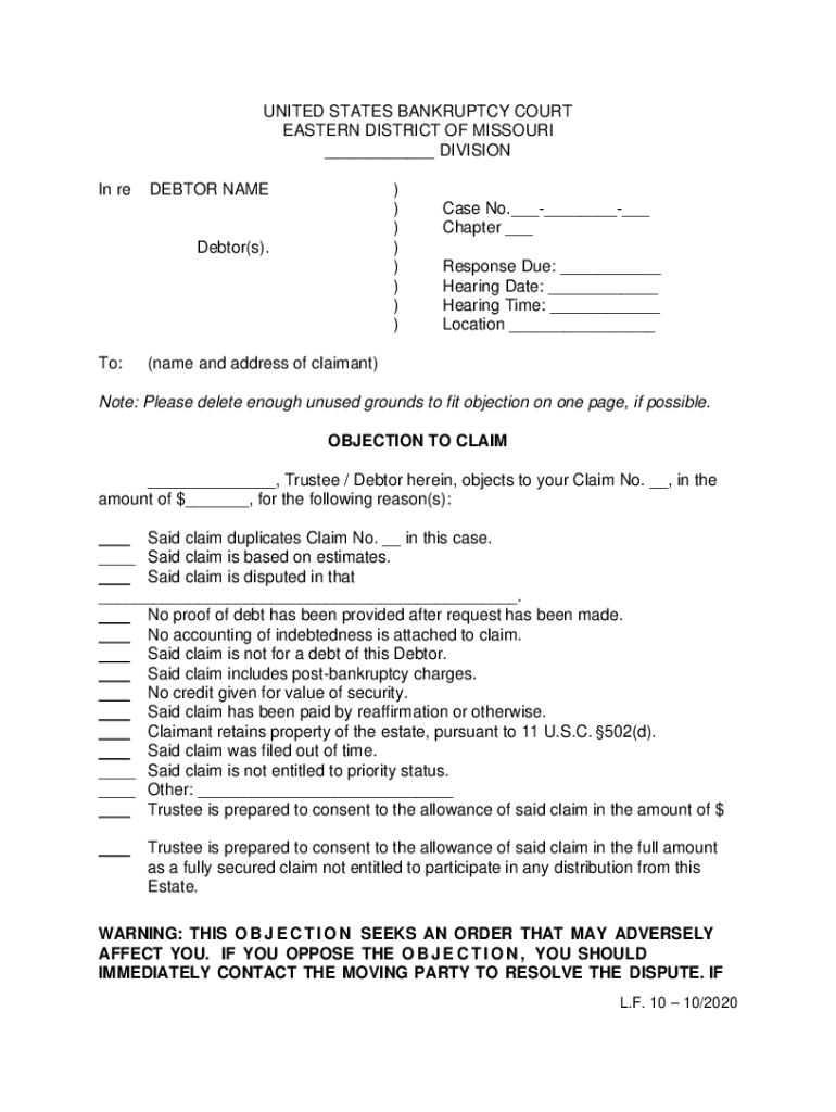UNITED STATES BANKRUPTCY COURT EASTERN DISTRICT OF MISSOURI DIVISION In receptor NAME))))))))Debtor(s). To:Case No. Chapter Response Due: Hearing Date: Hearing Time: Location (name and address of