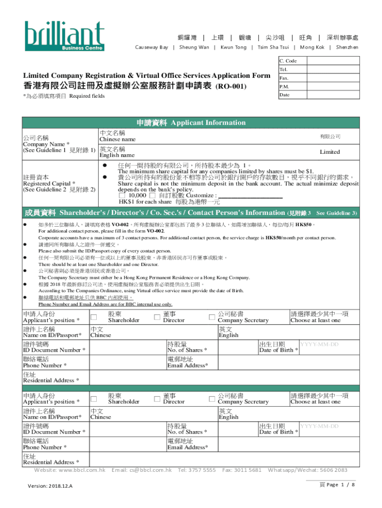 Causeway Bay Cheung Wan Kwan Tong Trim SHA Sui Mong KOK Shenzhen. Code Tel. Limited Company Registration & Virtual Office Services Application Form (RO001)Fax. P.M. Date* Required fields Applicant