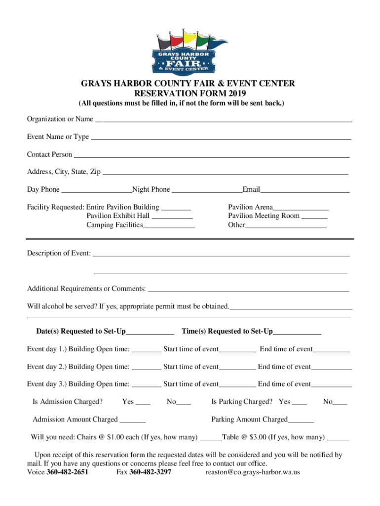 GRAYS HARBOR COUNTY FAIR & EVENT CENTER RESERVATION FORM 2019 (All questions must be filled in, if not the form will be sent back.) Organization or Name Event Name or Type Contact Person Address,