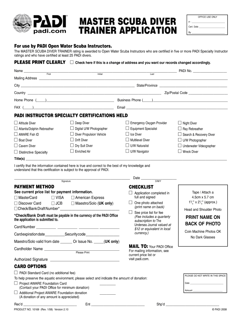 Only certified PADI Open Water Scuba Instructors can apply for the Master Scuba Diver Trainer rating using this form.