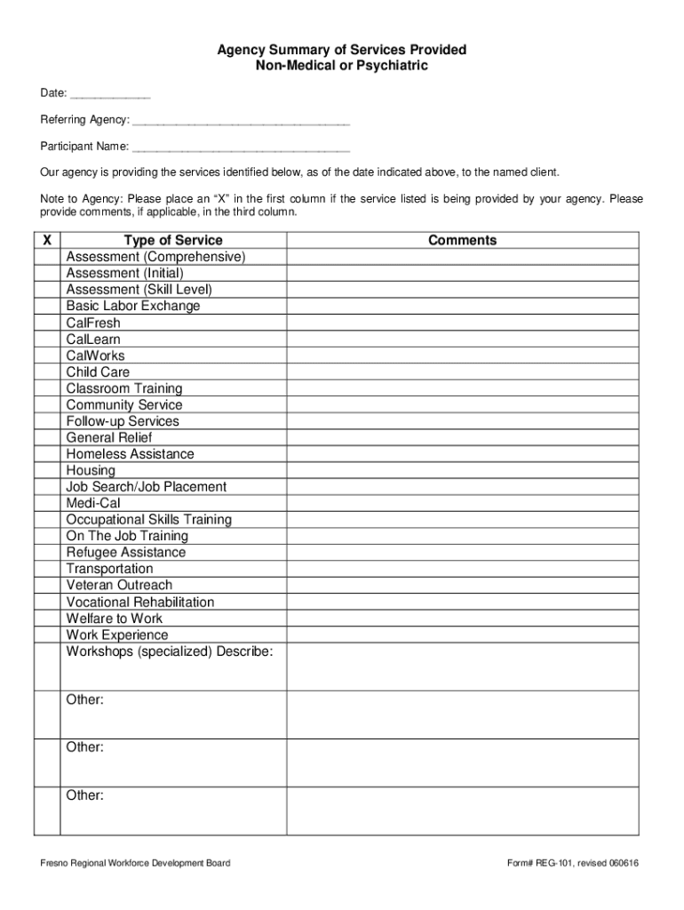 Agency Summary of Services Provided NonMedical or Psychiatric Date: Referring Agency: Participant Name: Our agency is providing the services identified below, as of the date indicated above, to the