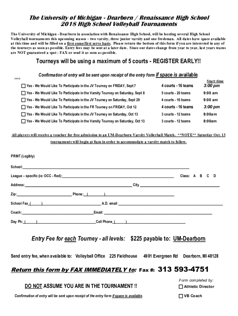 The University of Michigan Dearborn / Renaissance High School 2018 High School Volleyball Tournaments The University of Michigan Dearborn in association with Renaissance High School, will be hosting
