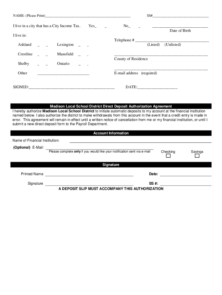 NAME: (Please Print) I live in a city that has a City Income Tax. Yes SS# No Date of Birth live in: Ashland Lexington Crest line Mansfield Shelby Ontario Other Telephone # (Listed) (Unlisted) County