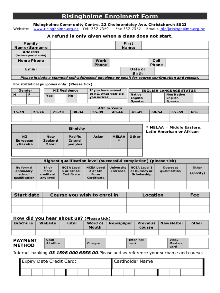 The Risingholme enrolment form is needed by individuals who wish to enroll in courses or programs offered by Risingholme Community Centre. This form is required for both new students and returning students who want to continue their studies at Risingholme.