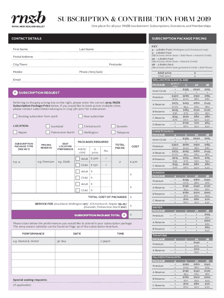 SUBSCRIPTION & CONTRIBUTION FORM 2019 One place for all your RNB involvement: Subscriptions, Donations and MembershipsCONTACT DETAILSSUBSCRIPTION PACKAGE PRICINGFirst Name:Keyless Name: 4 Ballet Pack