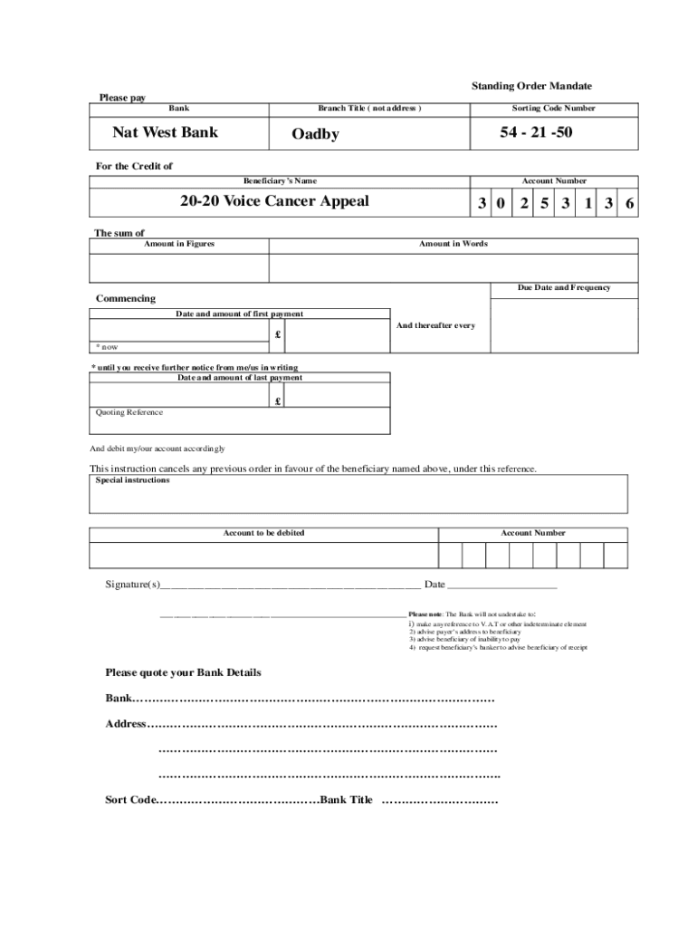 Standing Order Mandate Please pay Bank Branch Title (not address)Royal Bank of Scotland Nat WestOadbyMarket StreetSorting Code Number1623 54 21 5021For the Credit of Beneficiaries NameAccount Number2020Leicester