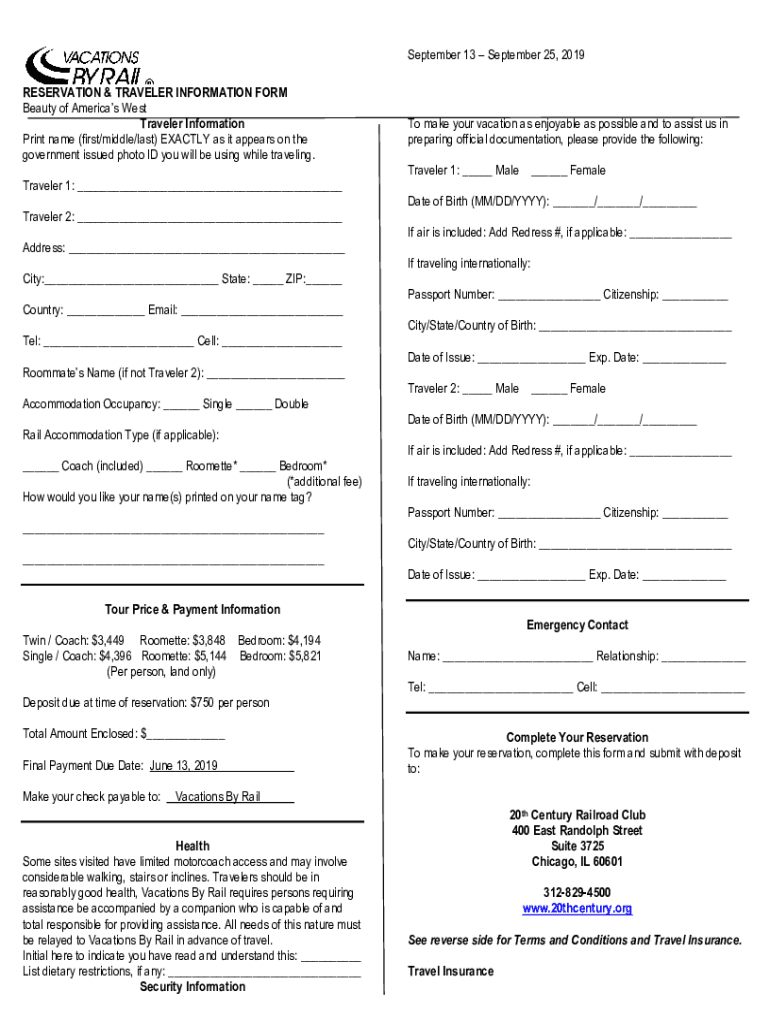 September 13 September 25, 2019, RESERVATION & TRAVELER INFORMATION FORM Beauty of Americas West Traveler Information Print name (first/middle/last) EXACTLY as it appears on the government issued