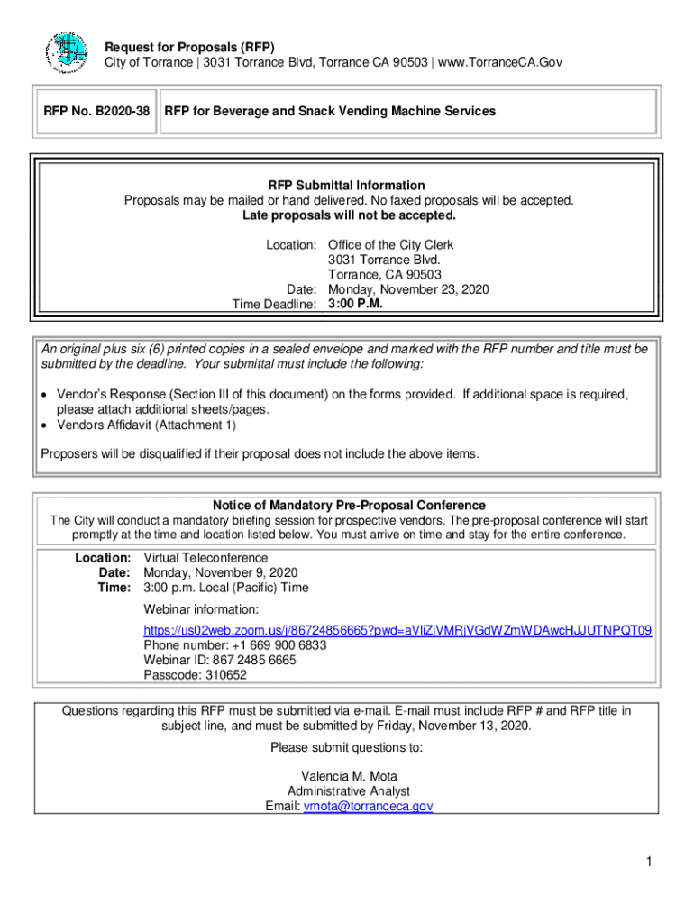 Request for Proposals (RFP) City of Torrance 3031 Torrance Blvd, Torrance CA 90503 www.TorranceCA. Gov RFP No. B202038RFP for Beverage and Snack Vending Machine Services RFP Submittal Information