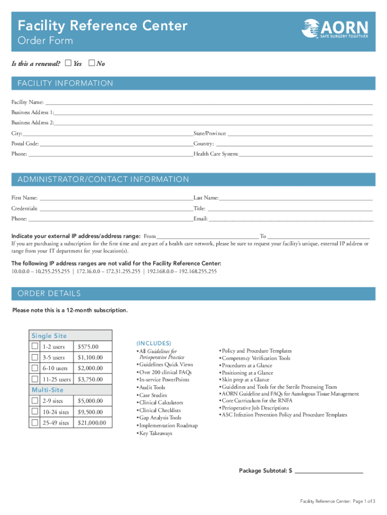 Facility Reference Center Order Form Is this a renewal? YesNoFACILITY INFORMATION Facility Name: Business Address 1: Business Address 2: City: State/Province: Postal Code: Country: Phone: Health Care