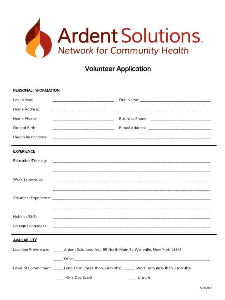 Volunteer Application PERSONAL INFORMATION Last Name: First Name: Home Address: Home Phone: Business Phone: Date of Birth: Email Address: Health Restrictions: EXPERIENCE Education/Training: Work Experience: