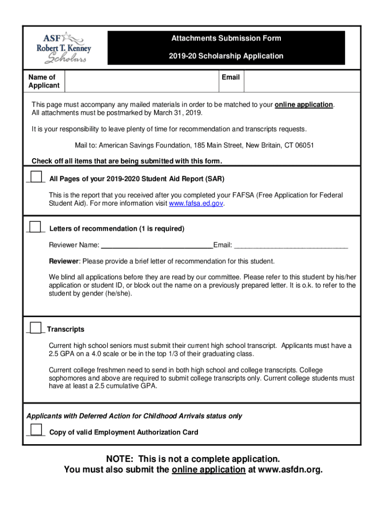 Attachments Submission Form 201920 Scholarship Application Name of ApplicantEmailThis page must accompany any mailed materials in order to be matched to your online application. All attachments must