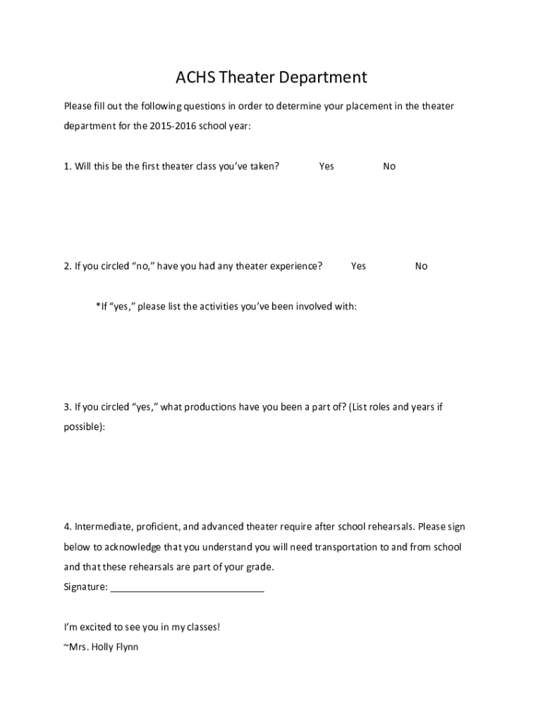 ACHSTheaterDepartment Pleasefilloutthefollowingquestionsinordertodetermineyourplacementinthetheater departmentforthe20152016schoolyear: 1. Willthisbethefirsttheaterclassyouvetaken? Denotes 2. Ifyoucircledno,