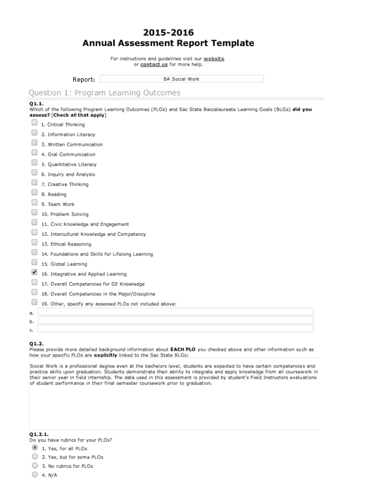 Get the free PDF 20152016 Annual Assessment Report Template - Sac State
