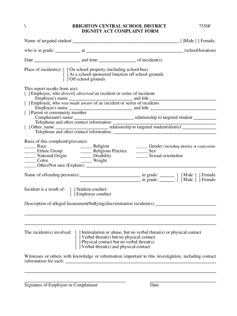 BRIGHTON CENTRAL SCHOOL DISTRICT DIGNITY ACT COMPLAINT Forename of targeted student:7550F, Male Female, who is in grade:attend time(school/location) of incident(s)Place of incident(s): On school property