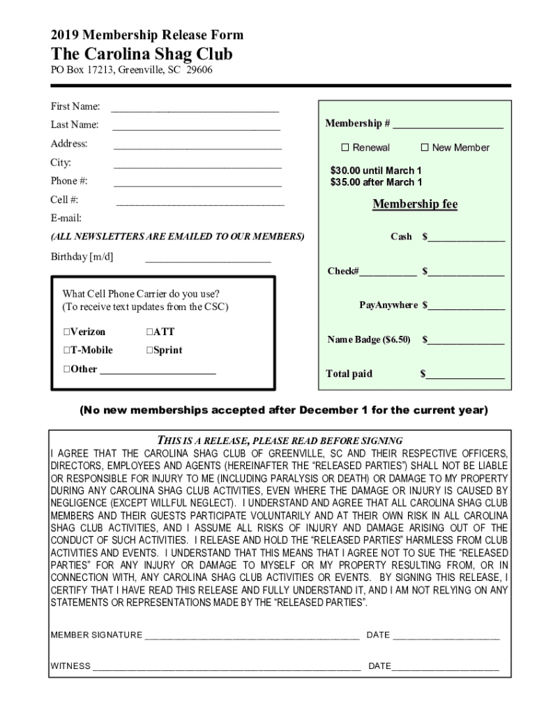 2019 Membership Release Forth Carolina Shag Club PO Box 17213, Greenville, SC 29606 First Name: Last Name: Address: City: Phone #: Cell #: Membership # Renewal New Member$30.00 until March $135.00