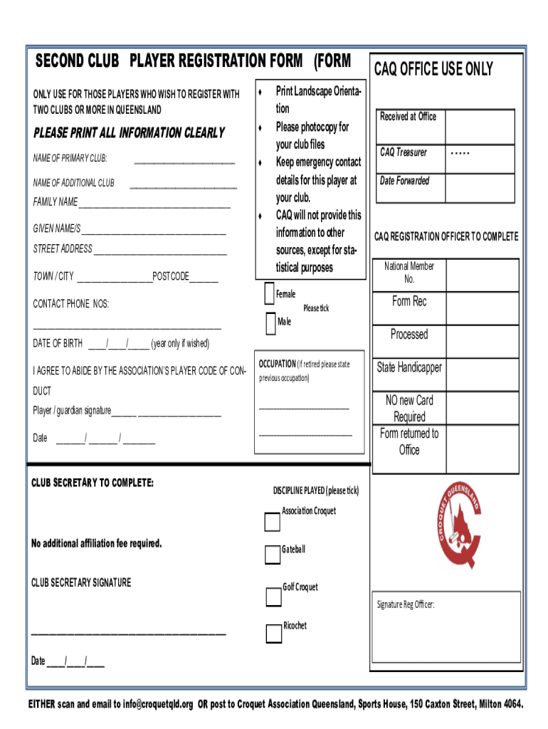 SECOND CLUB PLAYER REGISTRATION FORM ONLY USE FOR THOSE PLAYERS WHO WISH TO REGISTER WITH TWO CLUBS OR MORE IN QUEENSLANDPLEASE PRINT ALL INFORMATION CLEARLYNAME OF PRIMARY CLUB:NAME OF ADDITIONAL