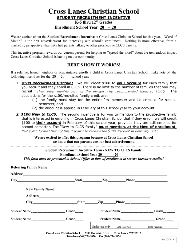 Cross Lanes Christian School STUDENT RECRUITMENT INCENTIVEK5 through 12th Grades Enrollment School Year 20 20 We are excited about the Student Recruitment Incentive at Cross Lanes Christian School