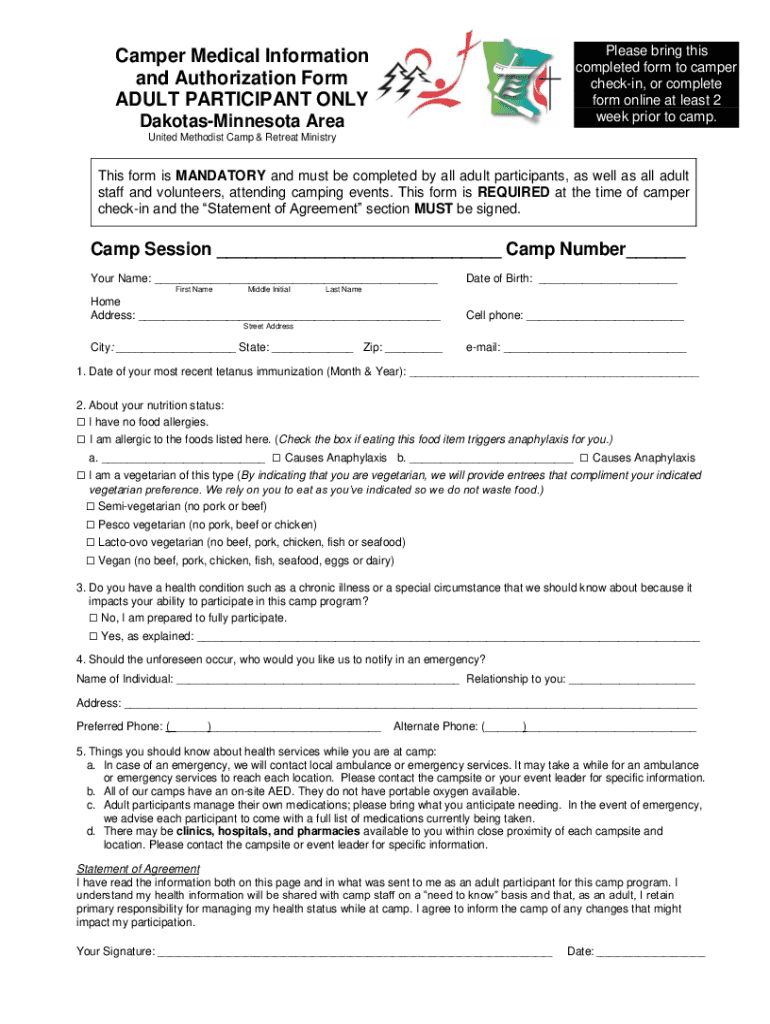 Please bring this completed form to camper checking, or complete form online at least 2 weeks prior to camp. Camper Medical Information and Authorization Form ADULT PARTICIPANT ONLY Dakotas Minnesota