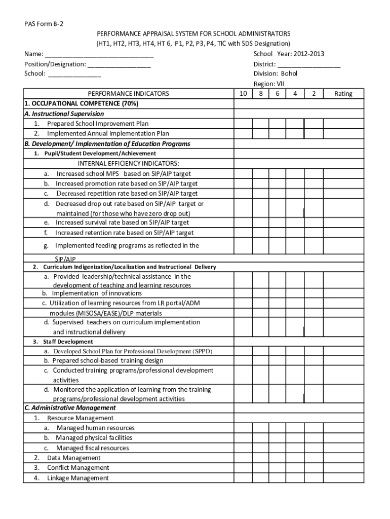 PAS Form B2 PERFORMANCE APPRAISAL SYSTEM FOR SCHOOL ADMINISTRATORS (HT1, HT2, HT3, HT4, HT 6, P1, P2, P3, P4, TIC with SDS Designation) Name: School Year: 20122013 Position/Designation: District: