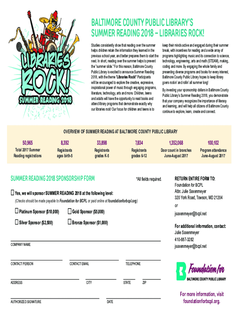 BALTIMORE COUNTY PUBLIC LIBRARY SUMMER READING 2018 LIBRARIES ROCK! Studies consistently show that reading over the summer helps children retain the information they learned in the previous school