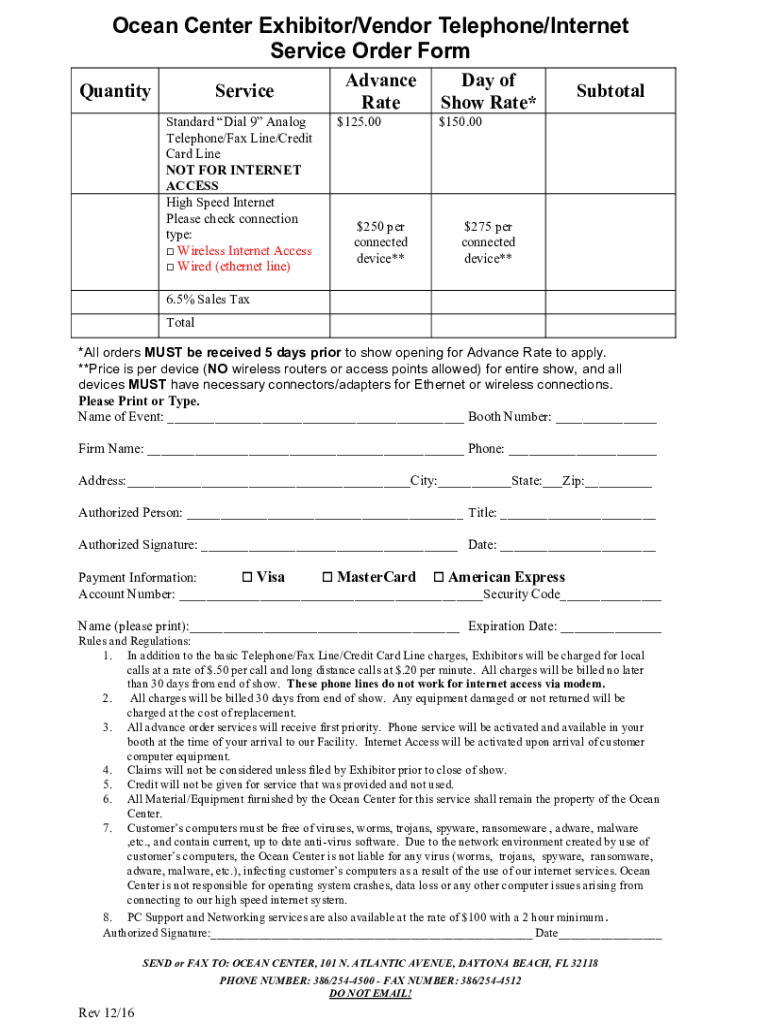 Ocean Center Exhibitor/Vendor Telephone/Internet Service Order Form QuantityService Standard Dial 9 Analog Telephone/Fax Line/Credit Card Line NOT FOR INTERNET ACCESS High Speed Internet Please check