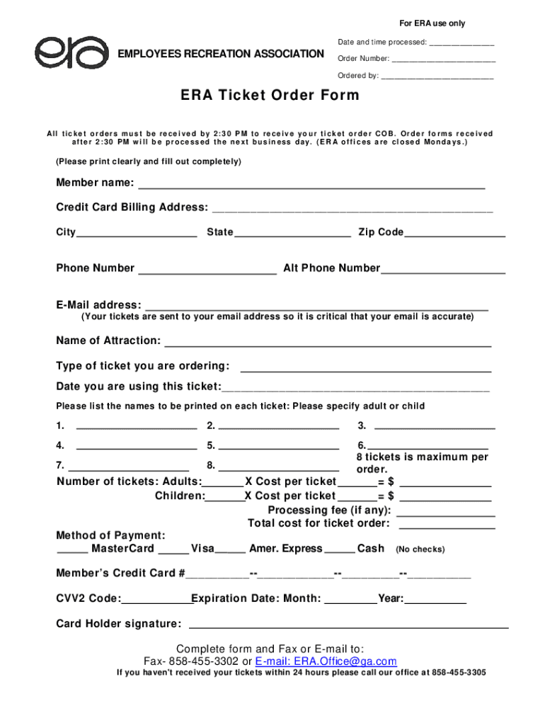For ERA use only Date and time processed: EMPLOYEES RECREATION ASSOCIATIONOrder Number: Ordered by: ERA Ticket Order Form Al l t i c k e t o r d e r s m u s t b e r e c e i v e d b y 2 : 3 0 P M to