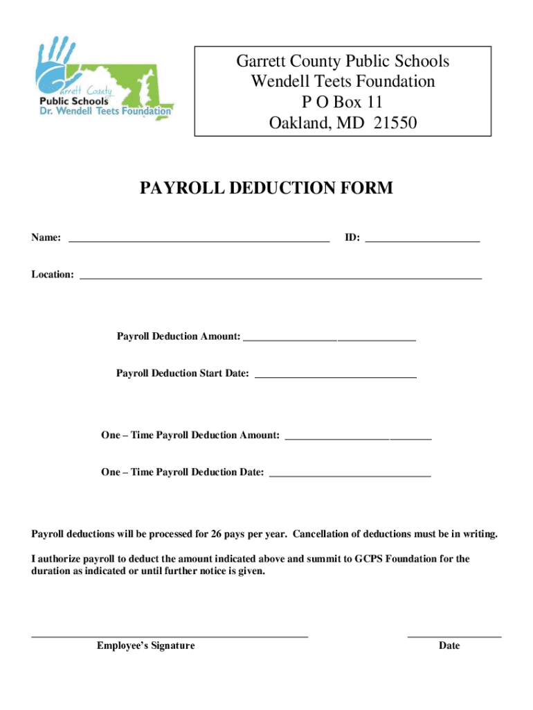 Garrett County Public Schools Wendell Meets Foundation P O Box 11 Oakland, MD 21550PAYROLL DEDUCTION FORM Name: ID: Location: Payroll Deduction Amount: Payroll Deduction Start Date: One Time Payroll
