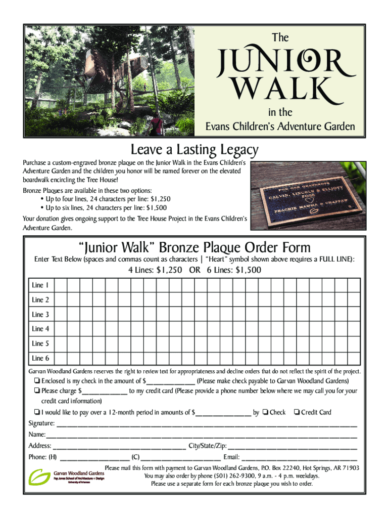 The Junior Walking the Evans Children's Adventure GardenLeave a Lasting LegacyPurchase a custom engraved bronze plaque on the Junior Walk in the Evans Children's Adventure Garden and the children