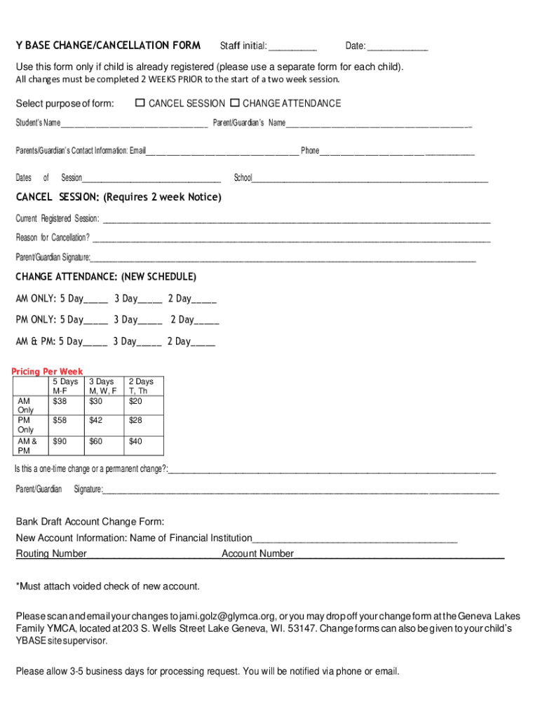 Y BASE CHANGE/CANCELLATION Forestall initial: Date: Use this form only if child is already registered (please use a separate form for each child). All changes must be completed 2 WEEKS PRIOR to the