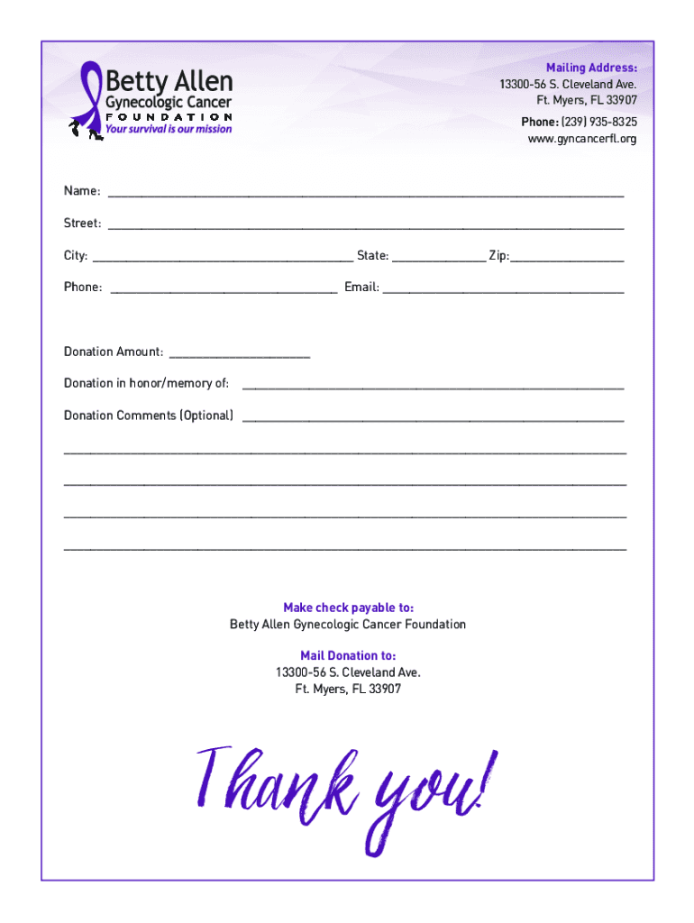 Mailing Address: 1330056 S. Cleveland Ave. Ft. Myers, FL 33907 Phone: (239) 9358325 www.gyncancerfl.orgName: Street: City: State: Zip: Phone: Email: Donation Amount: Donation in honor/memory of: Donation