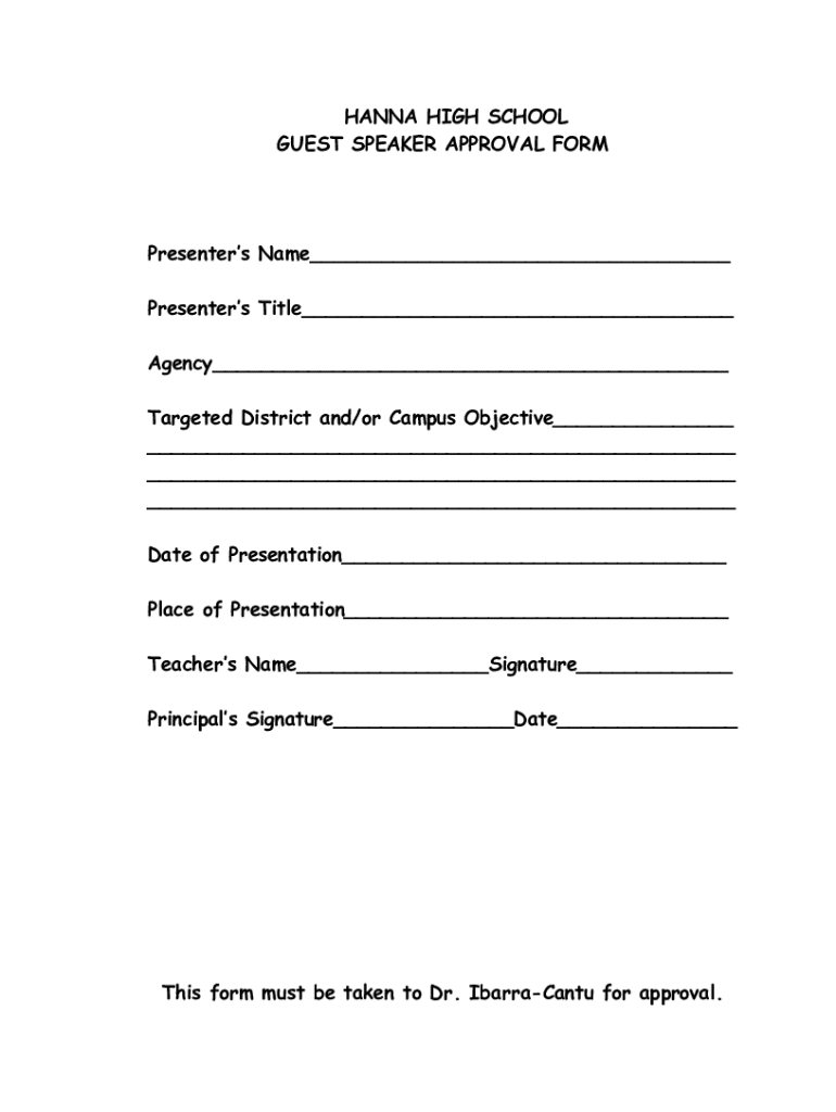 HANNA HIGH SCHOOL GUEST SPEAKER APPROVAL FORMPresenters Name Presenters Title Agency Targeted District and/or Campus Objective Date of Presentation Place of Presentation Teachers Name Signature Principals