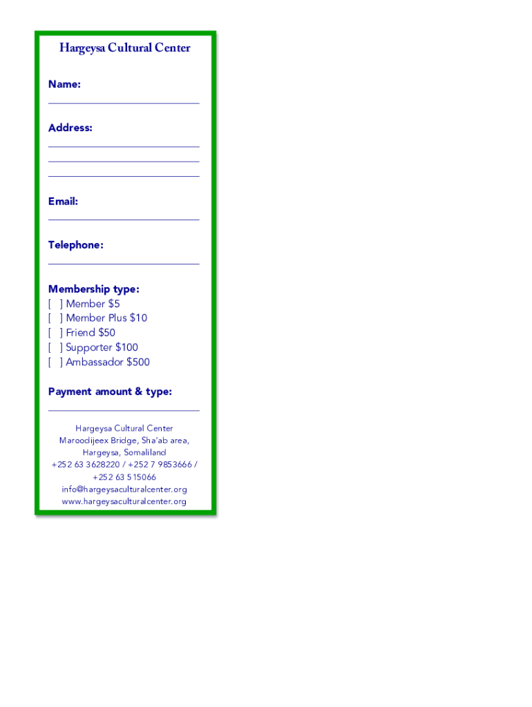 Vargas Cultural Center Name: Address: Email: Telephone: Membership type: Member $5 Member Plus $10 Friend $50 Supporter $100 Ambassador $500 Payment amount & type: Vargas Cultural Center Maroodijeex
