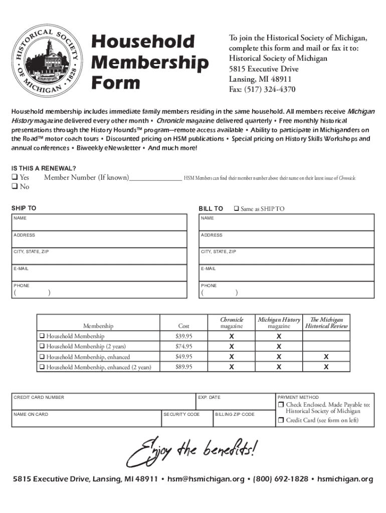 Household Membership Form joins the Historical Society of Michigan, complete this form and mail or fax it to: Historical Society of Michigan 5815 Executive Drive Lansing, MI 48911 Fax: (517) 3244370Household