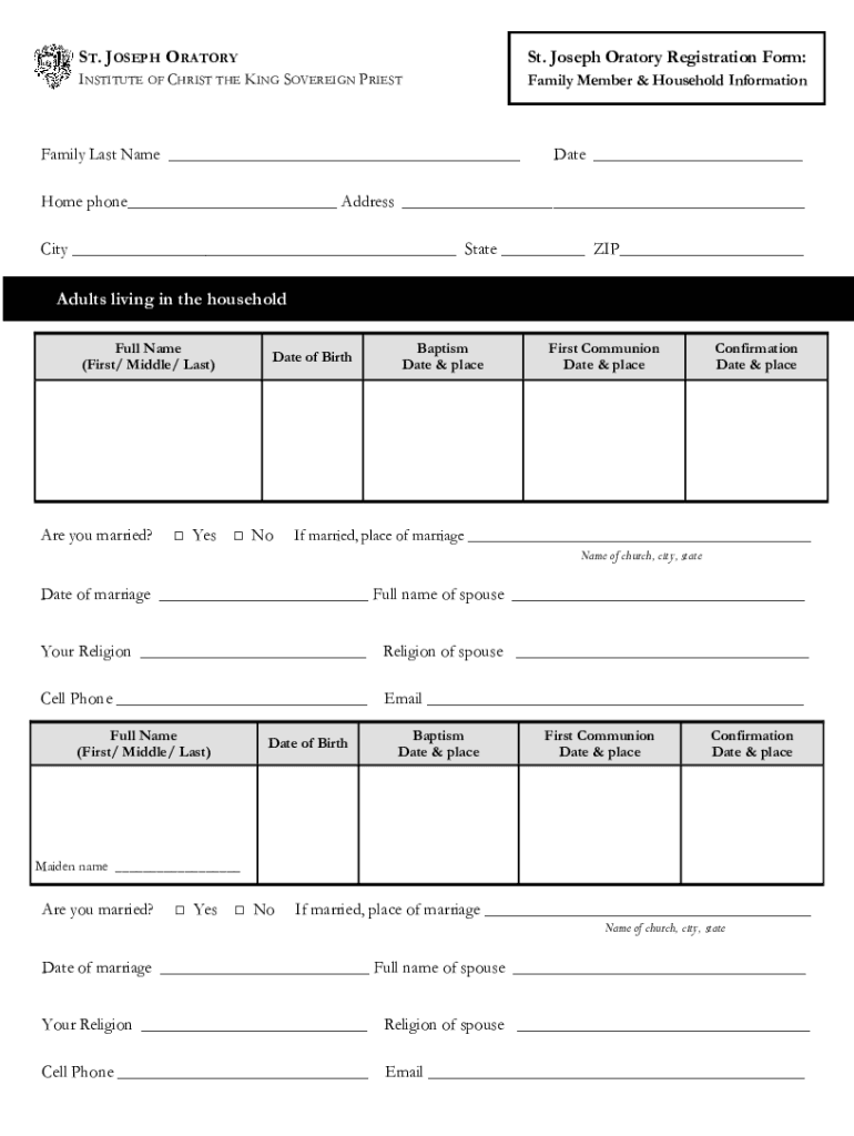 ST. JOSEPH ORATORY St. Joseph Oratory Registration Form:INSTITUTE OF CHRIST THE KING SOVEREIGN PRIESTFamily Member & Household InformationFamily Last Name Date Home phone Address City State ZIP Adults