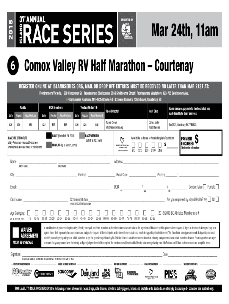 37 ANNUAL2018TH6PRESENTED BY Mar 24th, 11amComox Valley RV Half Marathon CourtenayREGISTER ONLINE AT ISLANDERS.ORG, MAIL OR DROP OFF ENTRIES MUST BE RECEIVED NO LATER THAN MAR 21ST AT: Front runners