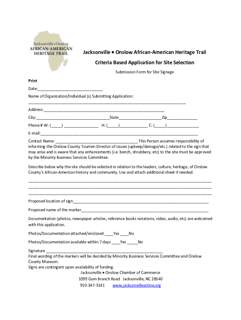 Jacksonville On slow African American Heritage Trail Criteria Based Application for Site Selection Submission Form for Site Signage Print Date: Name of Organization/Individual (s) Submitting Application:
