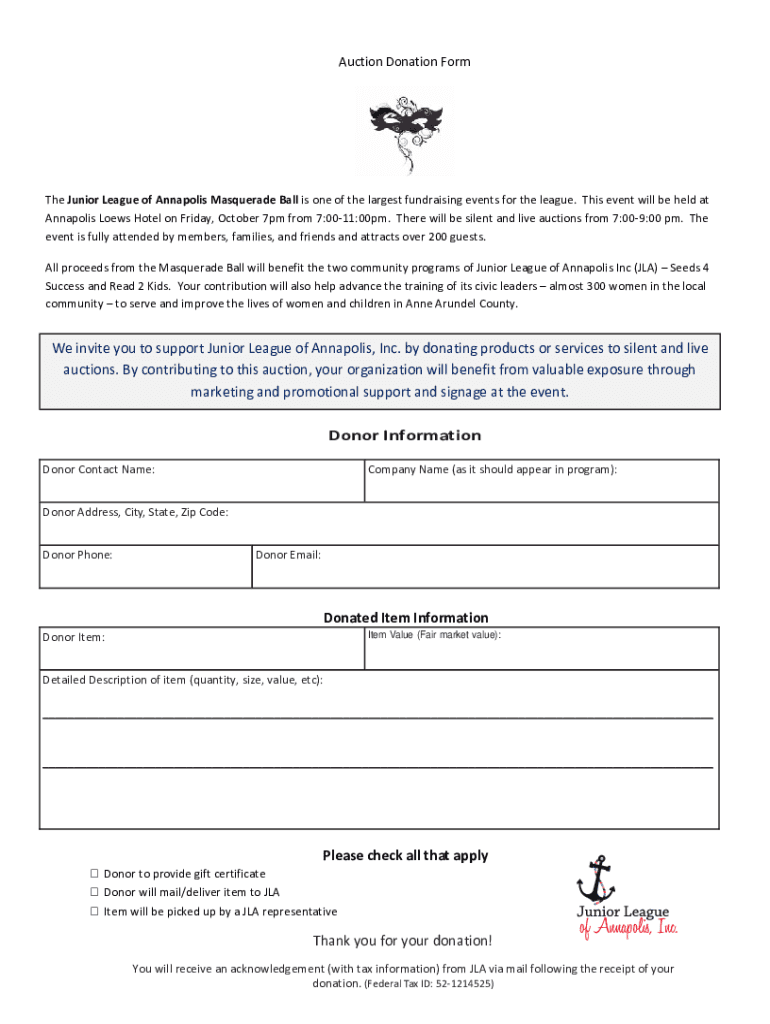 To fill out an auction donation form, provide details about the donated item, including its description, value, donor’s contact information, and any special instructions or restrictions.