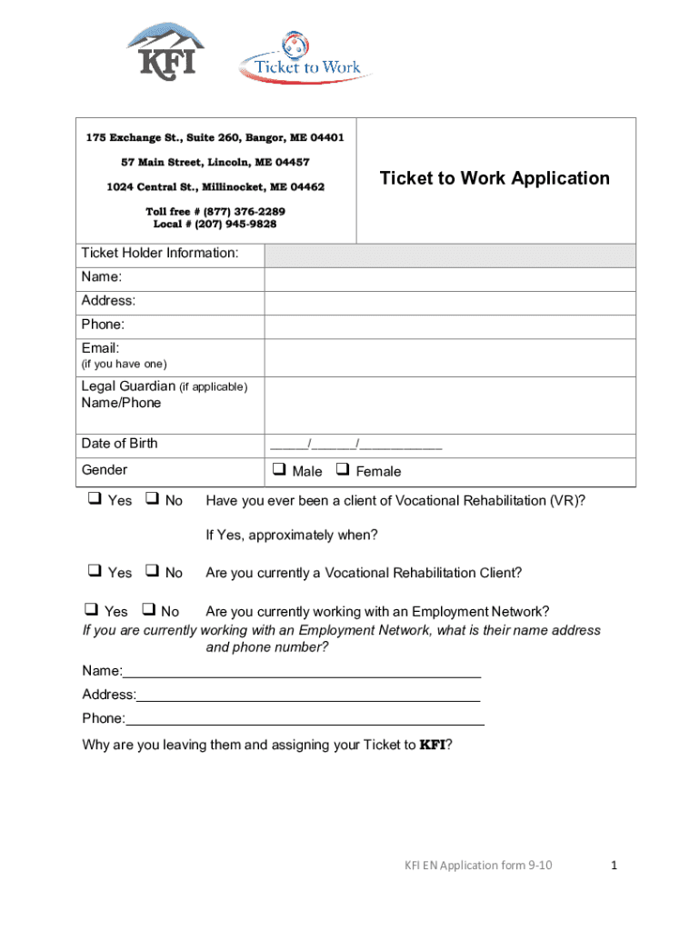 175 Exchange St., Suite 260, Bangor, ME 04401 57 Main Street, Lincoln, ME 04457 1024 Central St., Millinocket, ME 04462 Toll free # (877) 3762289 Local # (207) 9459828Ticket to Work ApplicationTicket
