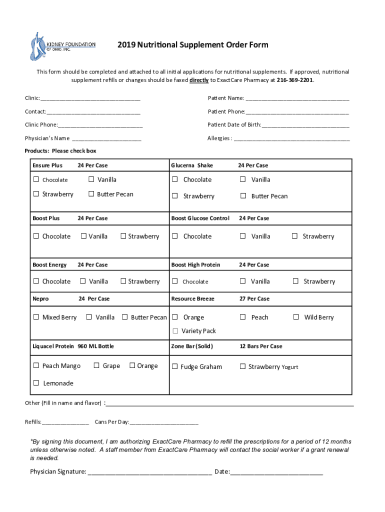 2019 Nutritional Supplement Order Form This form should be completed and attached to all initial applications for nutritional supplements. If approved, nutritional supplement refills or changes should
