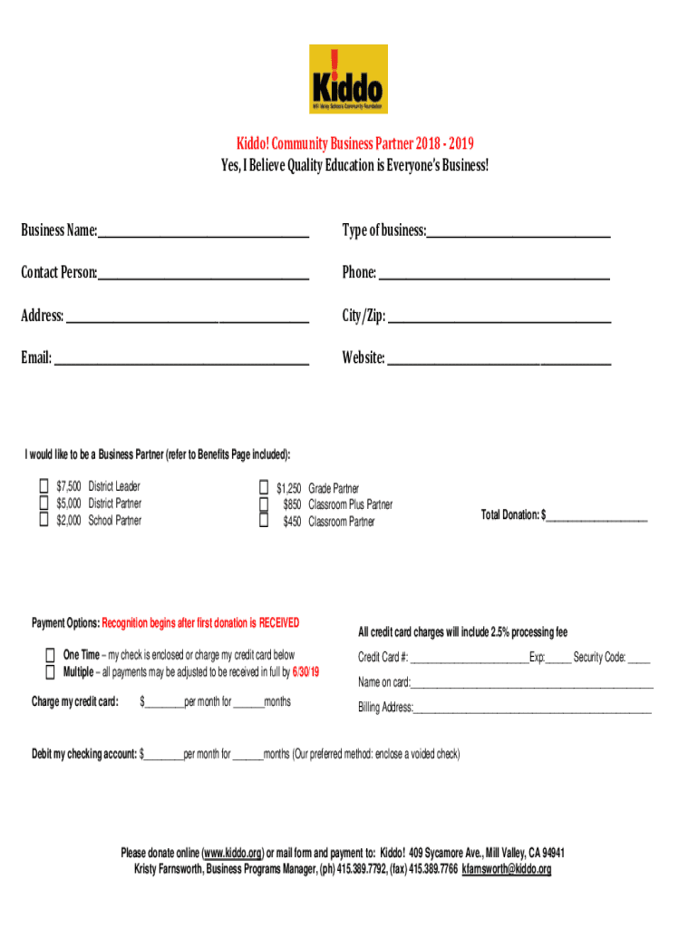 Kiddo! Community Business Partner 2018 2019 Yes, I Believe Quality Education is Everyone's Business! Business Name: Type of business: Contact Person: Phone: Address: City/Zip: Email: Website: I would
