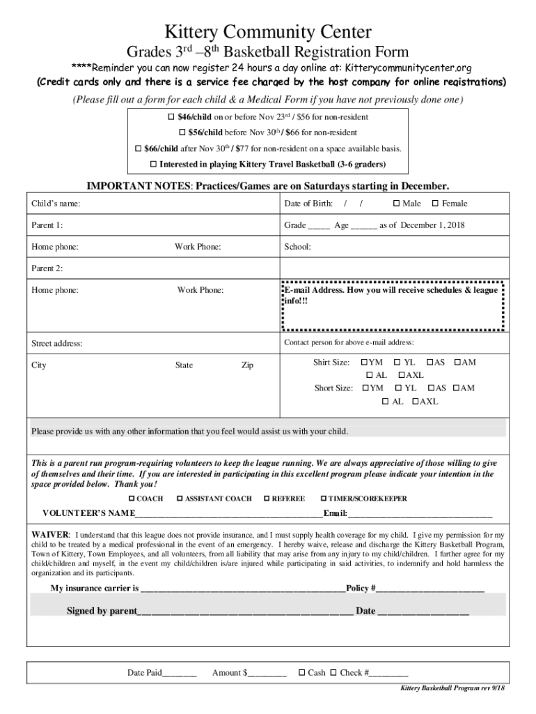 Jittery Community Center Grades 3rd 8th Basketball Registration Form****Reminder you can now register 24 hours a day online at: Kitterycommunitycenter.org (Credit cards only and there is a service