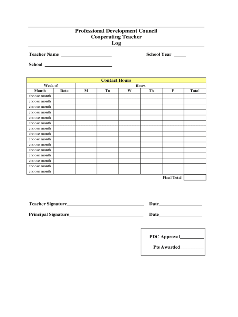 Professional Development Council Cooperating Teacher Log Teacher Name School Preschool Contact Hours Week of Month Date choose month choose monthHoursMTuWThFTotalFinal TotalTeacher Signature Date