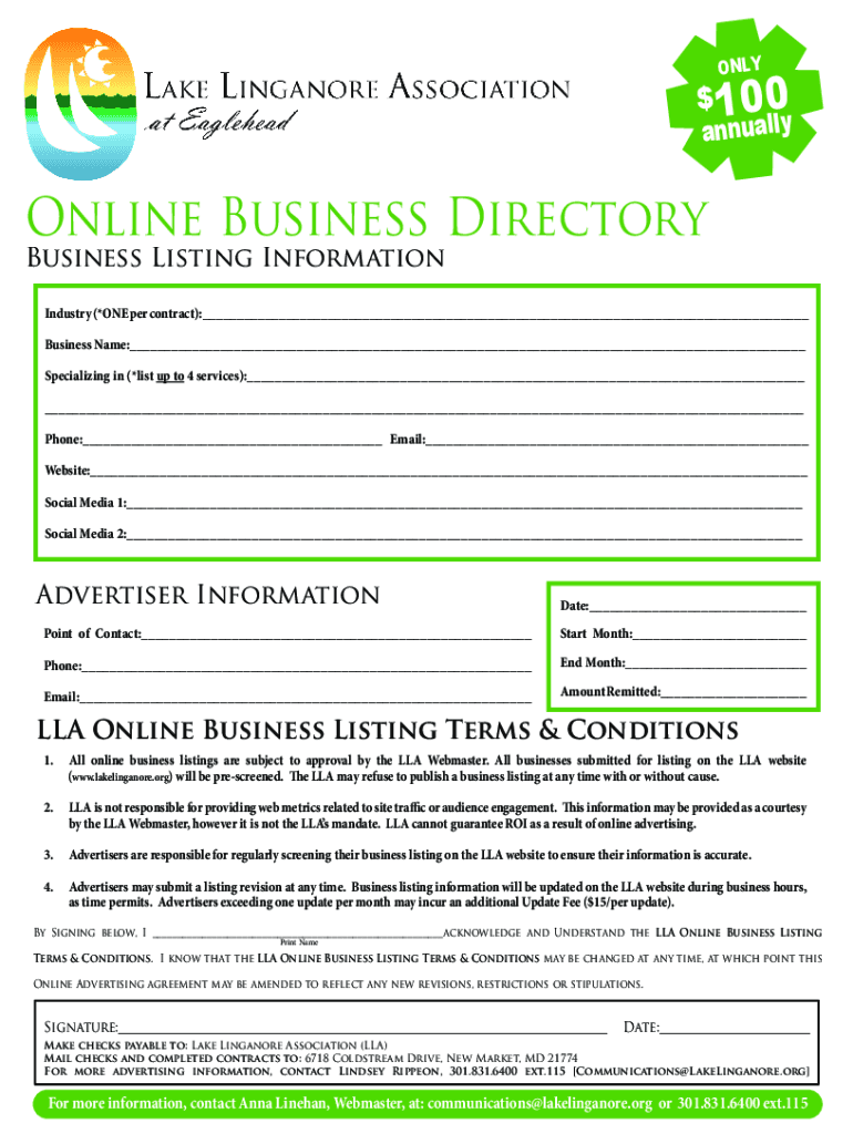 ONLY 100annuall online Business Directory Business Listing InformationIndustry (*ONE per contract): Business Name: Specializing in (*list up to 4 services): Phone: Email: Website: Social Media 1: